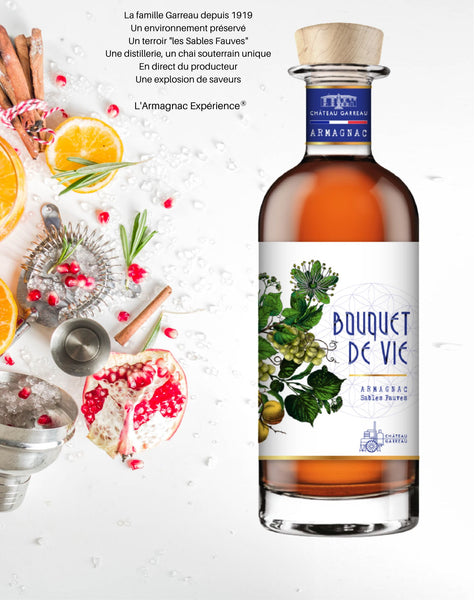 100 % Ugni Blanc. Flacon de 700 ml. Elevé minimum deux ans en barrique dans le chai souterrain du Château Garreau, unique en Armagnac
