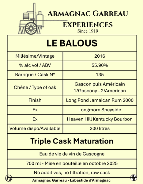 Arrivé en Gascogne, c’est un Bas Armagnac de la distillerie « Le Balous » (éteinte en 2019) qui a été choisi, un millésime de 2016, mono cépage 100% Baco.